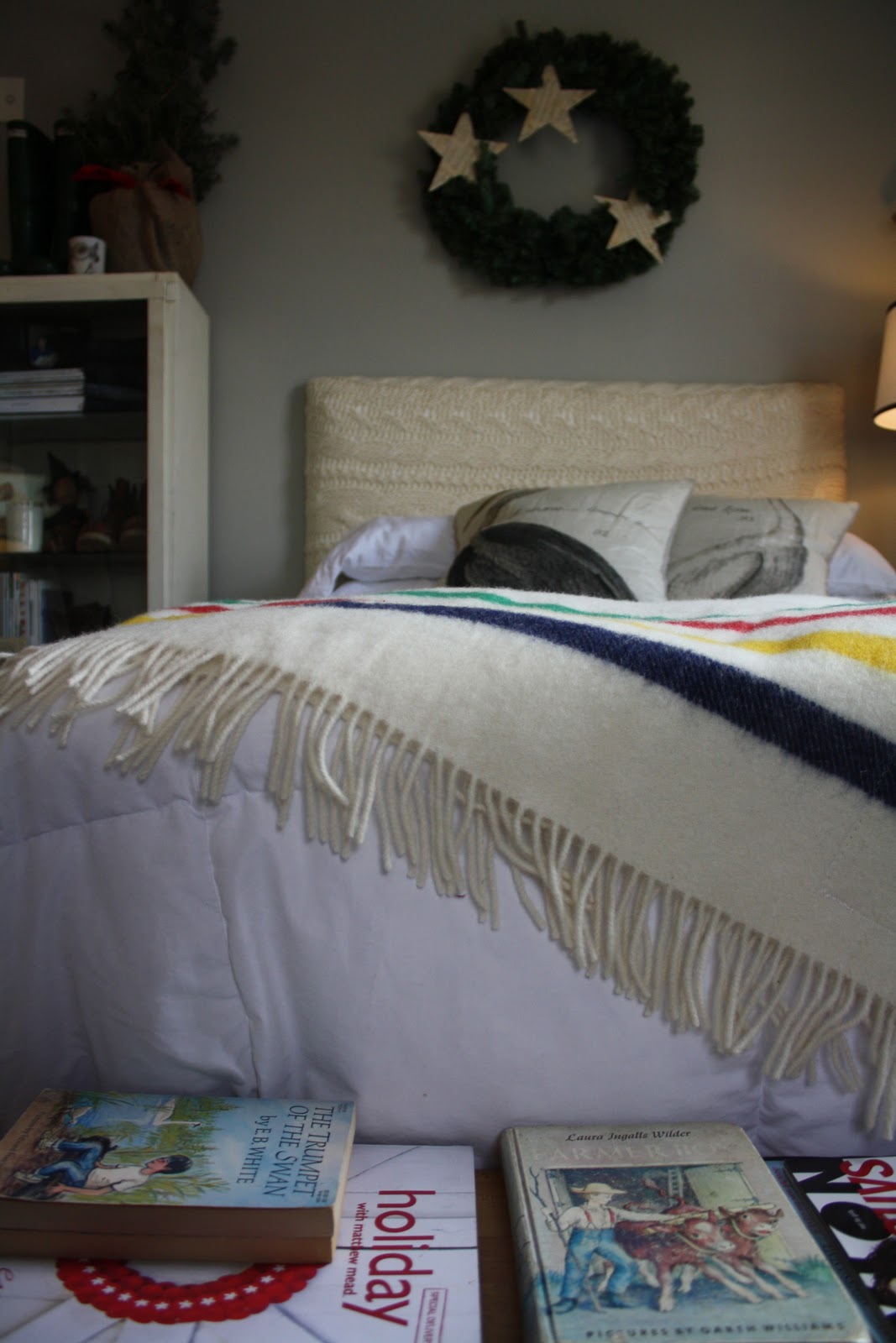 The headboard is covered in one of the throws from the Christmas issue cover. A Woolrich throw adds color.